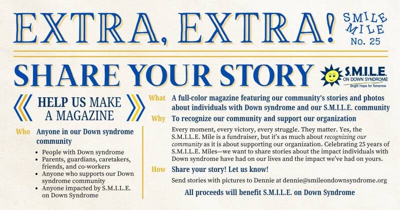S.M.I.L.E. Mile is about stories. Sharing them, celebrating them, and honoring them. This year, S.M.I.L.E. is calling on YOU to share your journey and be part of a special commemorative magazine filled entirely with your voices, experiences, photos, and stories about how S.M.I.L.E. or Down syndrome has impacted your life over the past 25 years. Please send submissions to dennie@smileondownsyndrome.org by July 15.